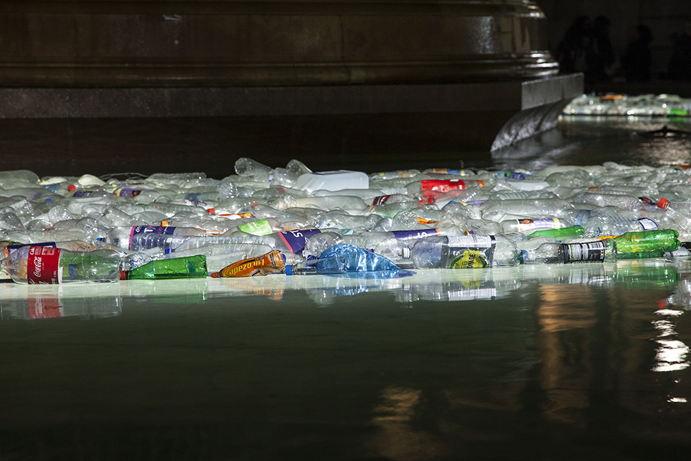 For this edition, they asked us to carry out a new version of our Plastic Island inside the fountains in Trafalgar Square. We could not say ‘No’ to such a challenge. Intervening such an emblematic place would help us to better spread our message on plastic massive usage.