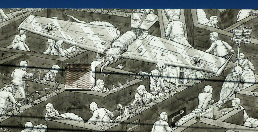 Wall Street bankers trapped in a maze, unable to escape the encroaching flames. This took 12 days to paint.